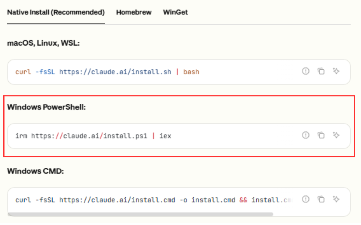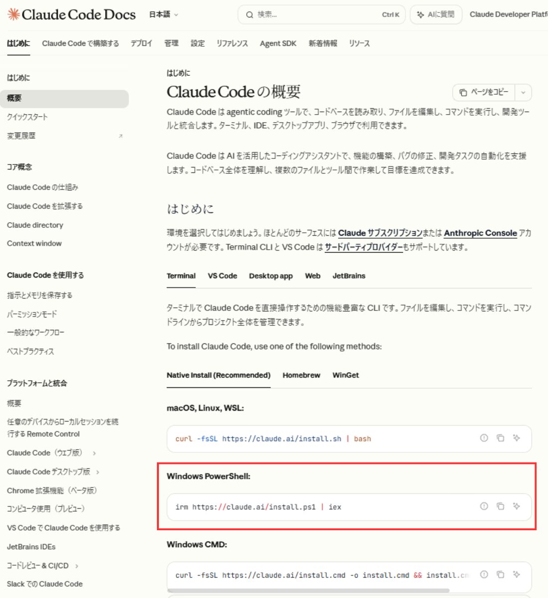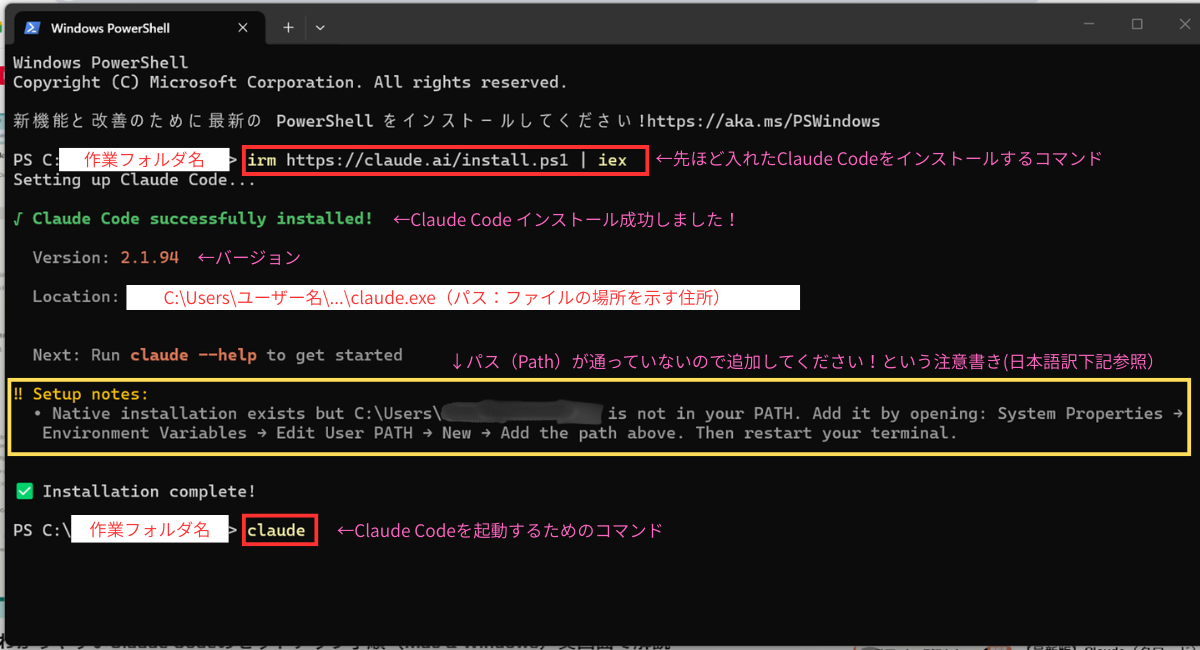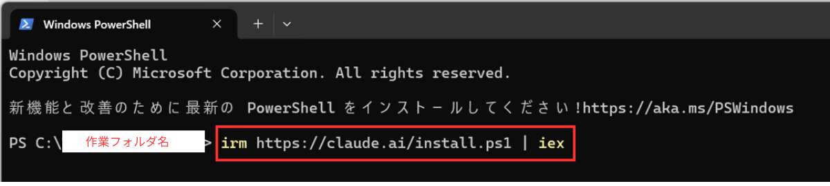 ✅ PowerShellで irm https://claude.ai/install.ps1 | iex を実行して