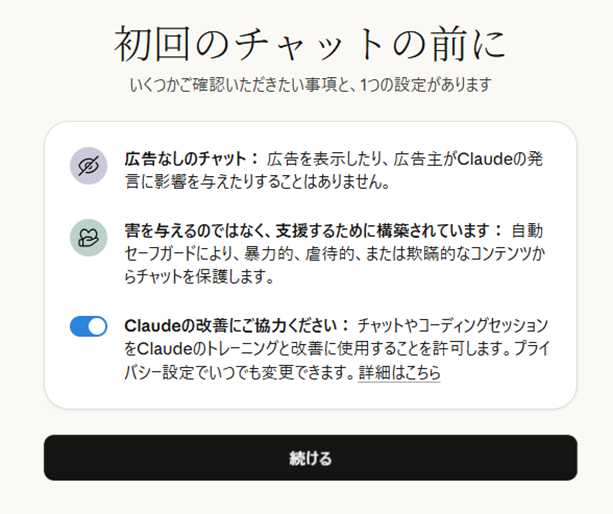一番下の「Claudeの改善にご協力ください」は任意ですが、個人情報の漏れなどが