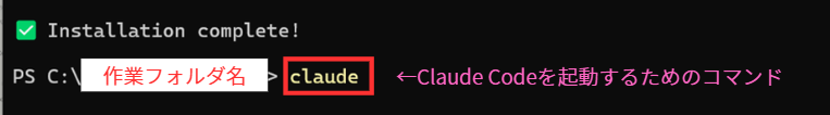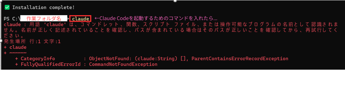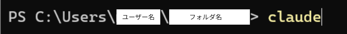 ④ 表示されたPowerShell(黒い画面)で claude と入力してEnter
