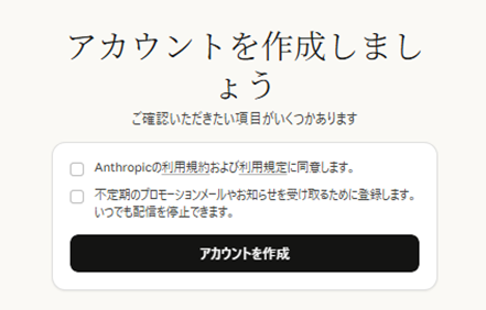 上の項目:「Anthropicの利用規約および利用規定に同意します。」はチェック必須です。