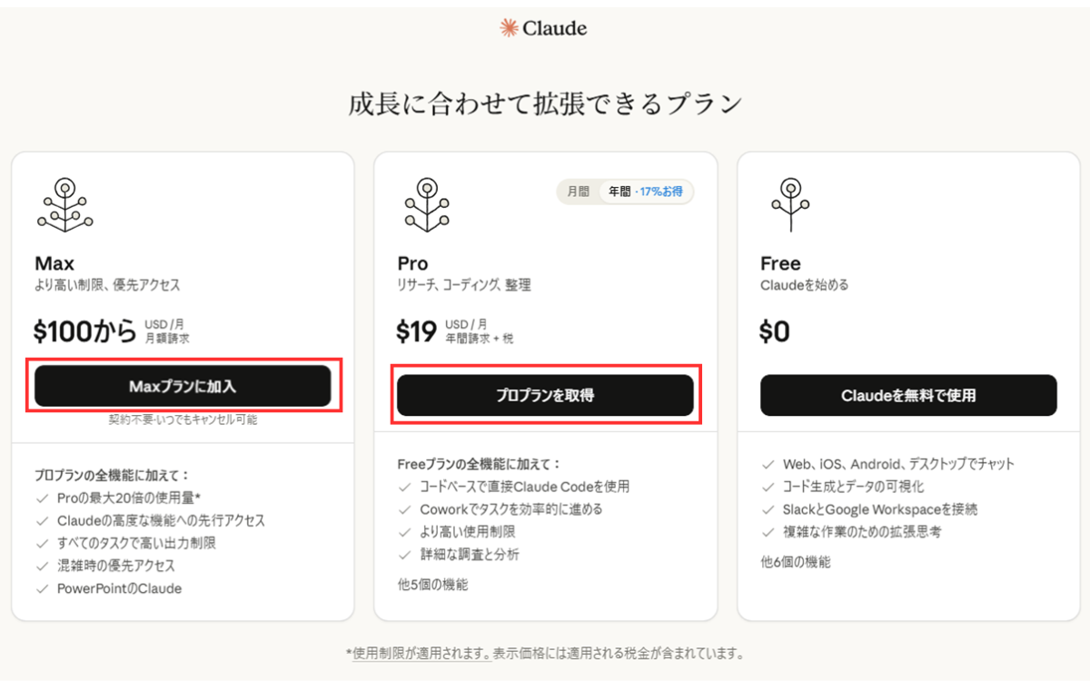 ① Claudeの有料プランに加入する場合