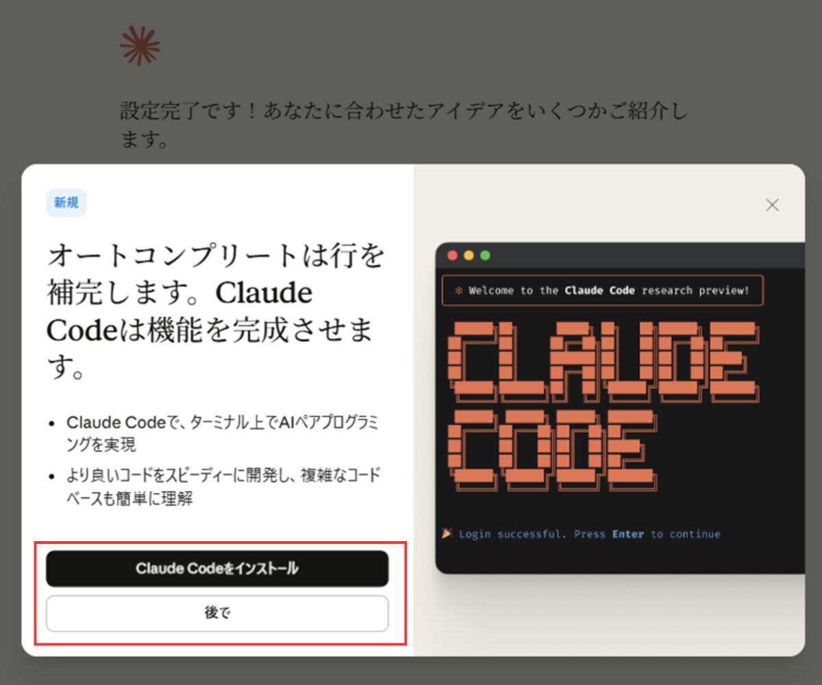 「Claude Codeをインストール」ボタンがありますが、その前に
