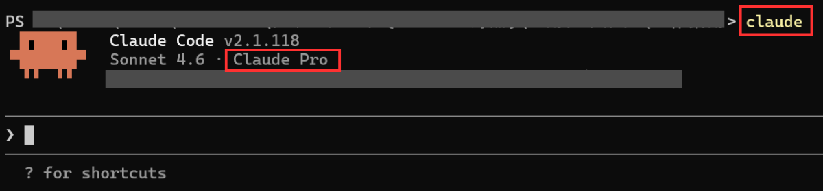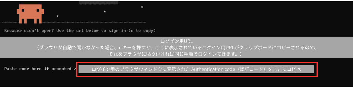これは、スペースや「–」も含め、そのまま丸ごとコピペしてEnterを押してください。「--」から始まる文字は「オプション(追加の指示)」と呼ばれ、Claudeを