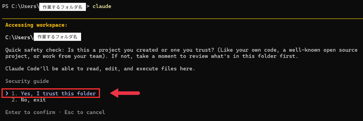 ⑤ 作業するフォルダが合っているか確認し、Yes, I trust this folder を選択してEnter。