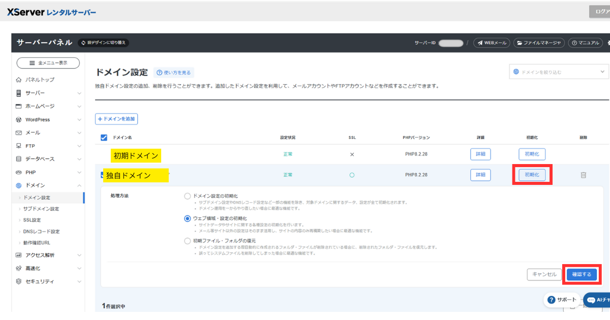 「ドメインの初期化」は、サーバーパネル内から行えます。
