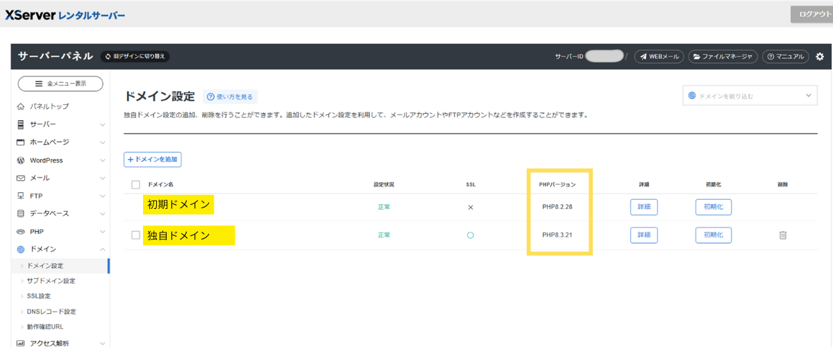 観察してみたところ、初期化した独自ドメインのPHPバージョンが新しいものに