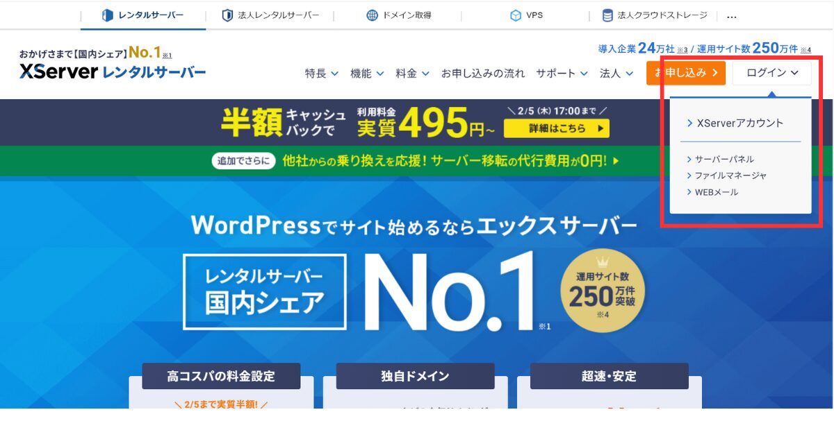 エックスサーバーを開き、右上の「ログイン」プルダウンから
