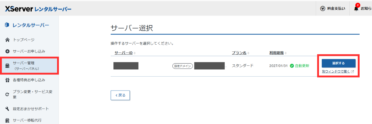 左側メニューの「サーバー管理(サーバーパネル)」を選択